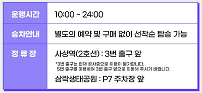 잔여 및 취소석 예매 : 10월 5일(금) 23:59:59 마감 - 탑승 최소인원 미달 시, 운행되지 않거나 다른 지역 노선과 통합 운행될 수도 있습니다