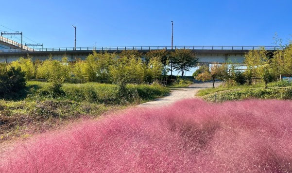 경남 합천 황강나루길 수변공원에는 핑크뮬리 군락지가 조성되어 있어 가을마다 핑크빛 물결이 이어집니다
