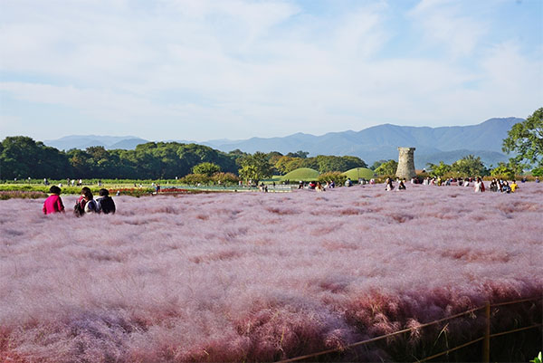 천년의 고도 경주에서는 첨성대, 왕릉 등 문화재와 핑크뮬리 군락이 아름답게 어우러져 멋진 경관을 감상할 수 있어요