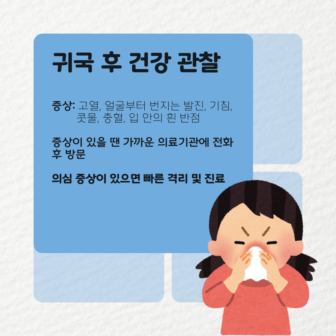 - 해외 여행을 마치고 귀국 후 3주간 건강 상태 관찰하세요.